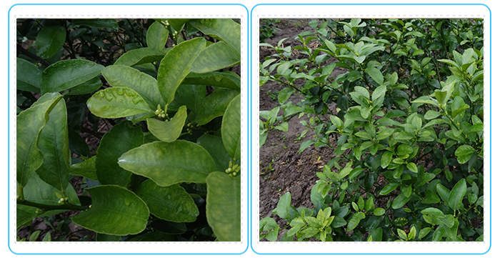 2017年3月13日,我们回访使用产品套餐后的柑橘树,叶片转绿,树势开始恢复,对比效果非常明显: