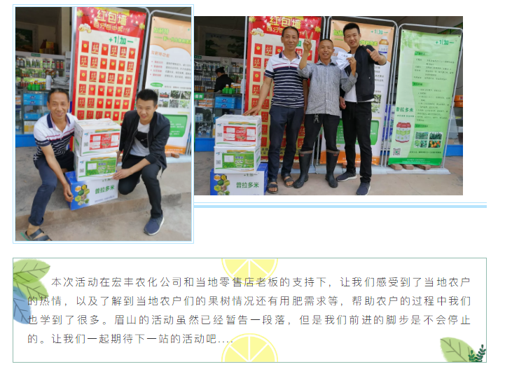 四川眉山,一个人杰地灵的地方。当地的主要种植作物为柑橘,现阶段果树正处于膨果壮果时期,此时以补充磷钾钙肥为主,膨大果实、提前预防日灼果!英联加一携手宏丰农化,就目前的用肥需要制定了对应的营养套餐,连续开展了数场惠农推广活动。