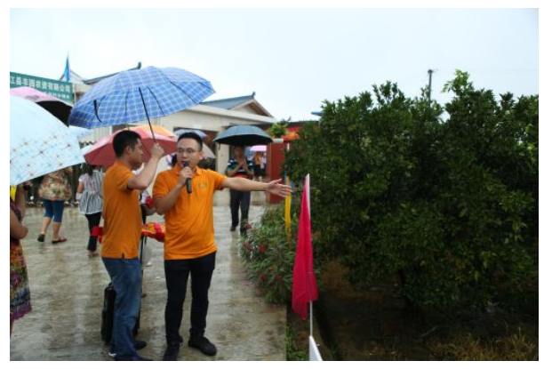 丰园农资的吴总带领着长长的队伍,向在场的来宾们详细的介绍了柑橘示范园使用加一产品前后的情况及其中的功效原理,并且向大家细致地讲解了产品运用在柑橘上的种植管理技术。
