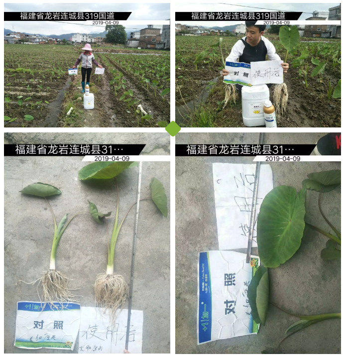 效果体现:同一块地,同一天种植,使用根满壮(鱼油型)的芋头高度有60cm,比使用其他产品的高出20cm、叶片宽度同比相差10cm,根系长度、数量等也明显较多且长。