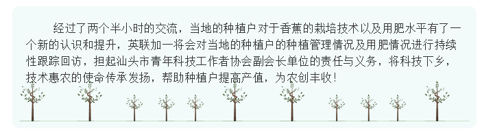 为贯彻落实国家、省和市有关科技下乡文件的精神,结合"精准扶贫"任务,不断提高农民的科学文化素质,继上一次在汕头市澄海区溪南镇的科技交流会成功举办后,深圳市英联加一生物科技有限公司联合汕头市青年科技工作者协会又一次开展技术下乡服务活动,来到了揭阳市揭西县,与当地的香蕉种植户进行种植管理和用肥技术交流。