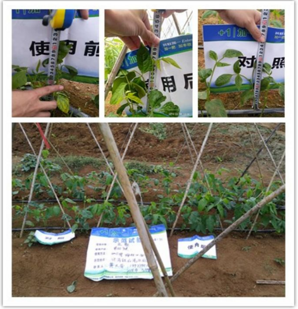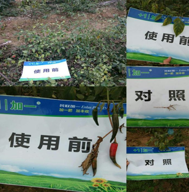 从图片我们可以清晰的看到没有使用普拉多米之前,辣椒缺素严重,叶片黄化瘦弱,辣椒产量低,着色不好,并且有枯萎的现象。