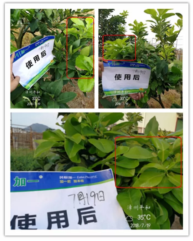 使用后: 蜜柚开始发出新叶 叶片快速转绿增厚
