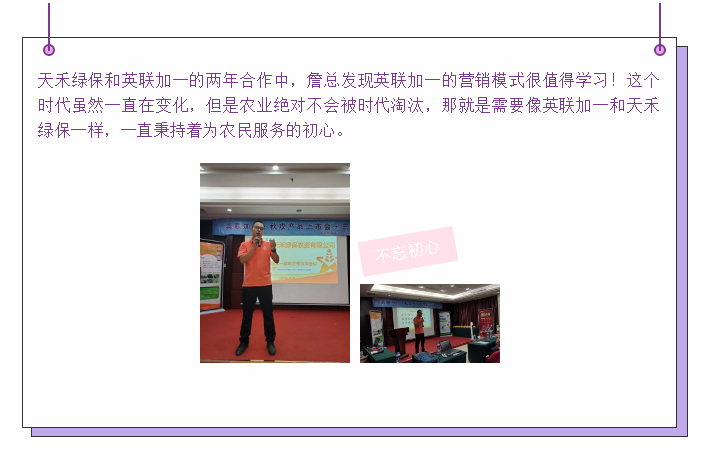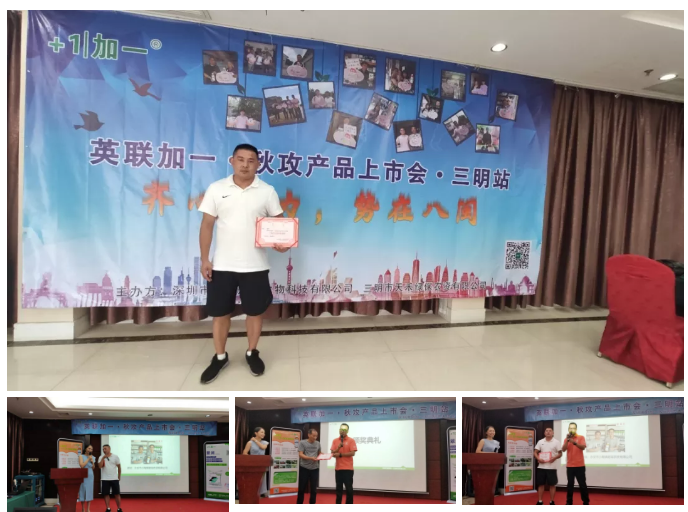 会议还有幸邀请到了两位优秀零售商朋友上台分享。作为英联加一产品年销售额上百万的忠实客户,他们对于英联加一公司以及加一产品有着绝对的发言权。余老板激动的跟我们分道:“我把加耐特用在瓜地上,一壶加耐特下去的地方全都是瓜,效果就是这么明显!”