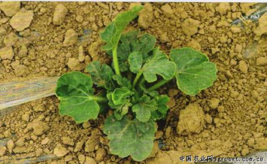 西瓜幼苗生长点退化,不能正常地抽生新叶,只有2片子叶,有的虽能形成1—2片真叶,但叶片萎缩,没有生长点。