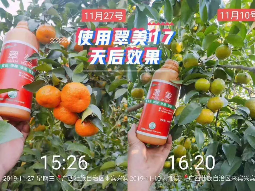 翠美--英联加一2015年上市的一款针对果实着色增重的产品。自上市以来,因其见效快、优良着色、绿色无害无污染的特点俘获了一大批铁粉。今年柳州金好年公司针对柑橘转色科学用肥的下乡推广与指导,更是获得了农户们满满的好评及点赞!