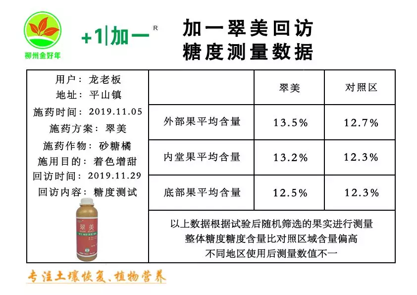 除此之外,我们也对果实的糖度进行了取样测试:从对比数据来看,无论是柑橘的外部果、内堂果还是底部果,使用过翠美的柑橘果实糖度均高于对照区。