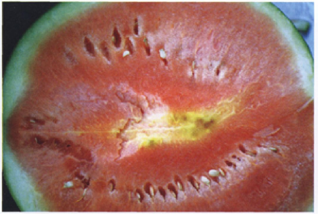 将西瓜纵向切开,从顶端花痕部到果柄部的维管束成为发达的纤维质带,通常多为白色,严重时呈黄色。