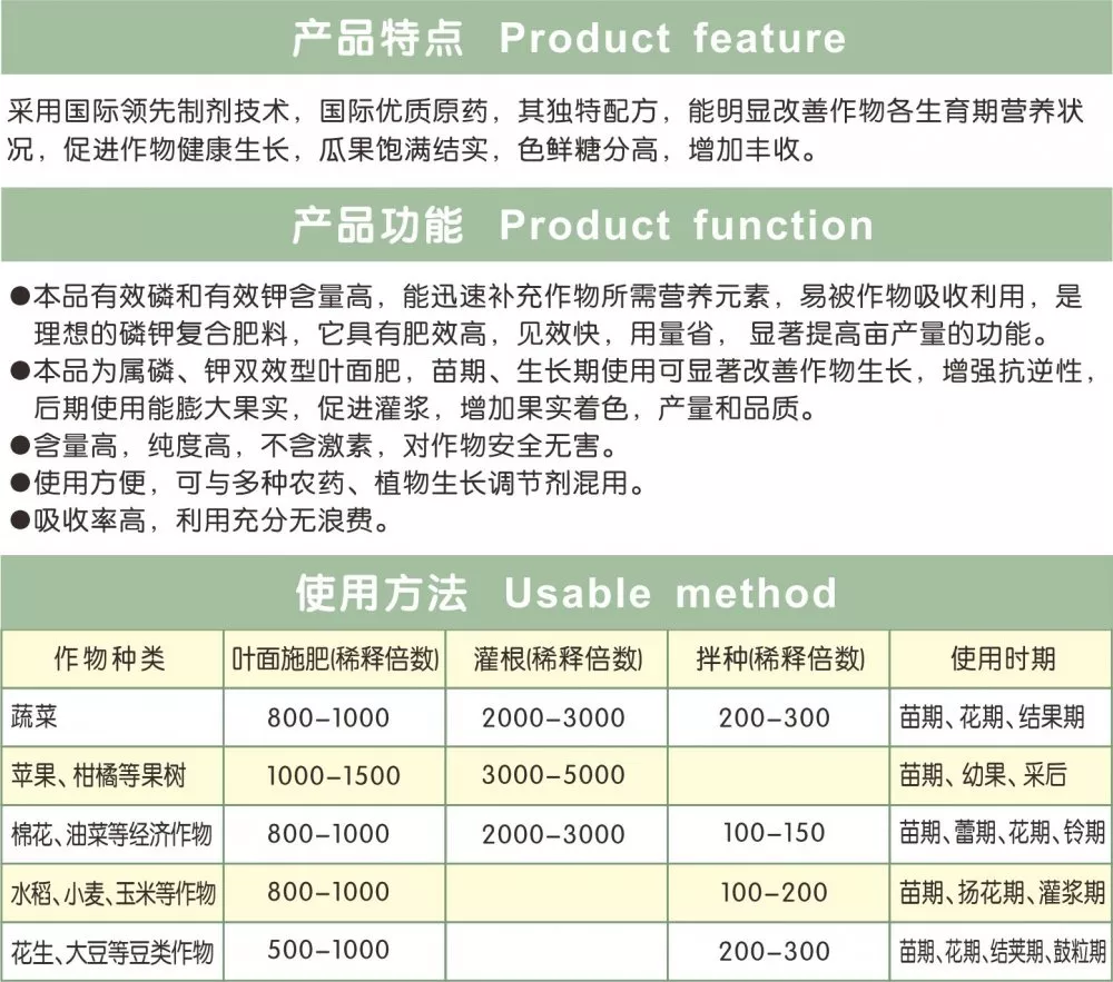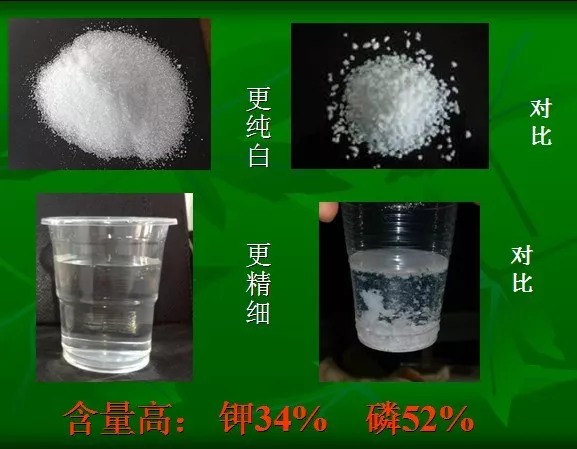 翠润这个产品是磷钾型复合肥,其中磷的含量是52%,钾的含量是34%,比普通产品在工艺上更加精细,更加纯白,大部分作物都可以使用,它能够有效的促花保花,壮果膨果,增甜着色,也是小麦、水稻等大田作物的叶面肥料。使用起来非常方便,可以喷施、冲施,也可以拌种、灌根。喷施时这一包400克的用800——1000斤水,冲施的话500倍稀释就可以,可以跟其他农药、肥料混用。