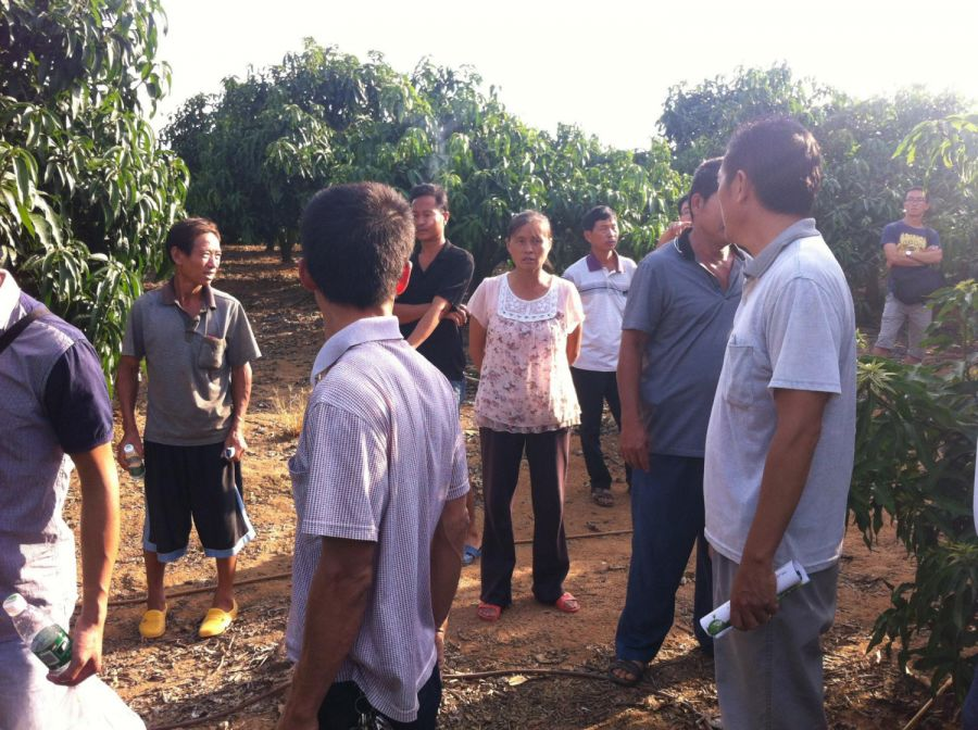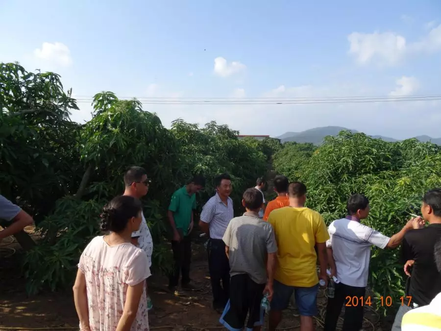 10月16日,南田农场红旗分场红东队的蒋大姐使用了加一高钾46催花后看到了十分明显的效果。于是海南省三亚市南田农场植物医院组织专业种植户近20多位,一行二三十人10月16日下午2点,开车前往蒋大姐家的芒果园进行实地观摩。