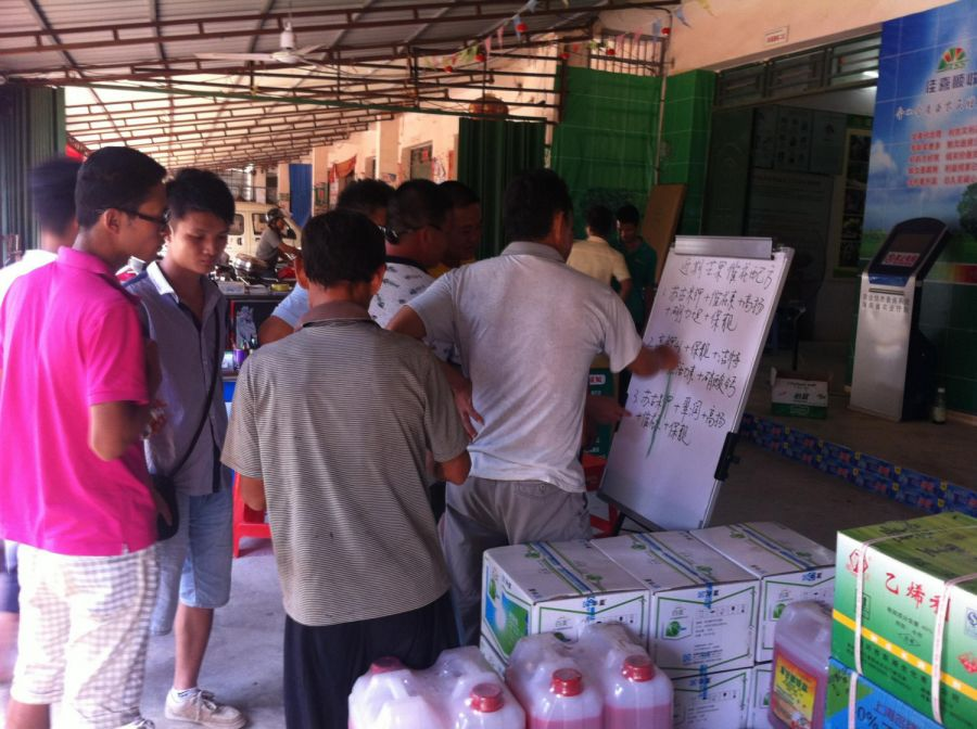 一到果地,大家迫不及待的来到使用过高钾46催花的台农树前,认真的查看,赞美催出来的花十分多而且十分整齐。并且和种植户蒋大姐聊起来:你的树下过多少肥?用了哪几种药催的?什么时间催的花?大家你一言我一语,积极的交流。场面十分热闹。