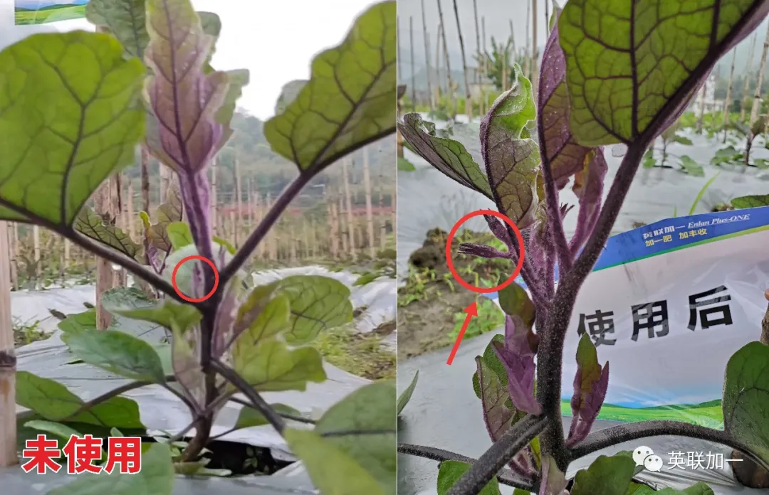 从图片上也可以看出,使用根满壮鱼油后的茄子比未使用的茄子要提前开花。