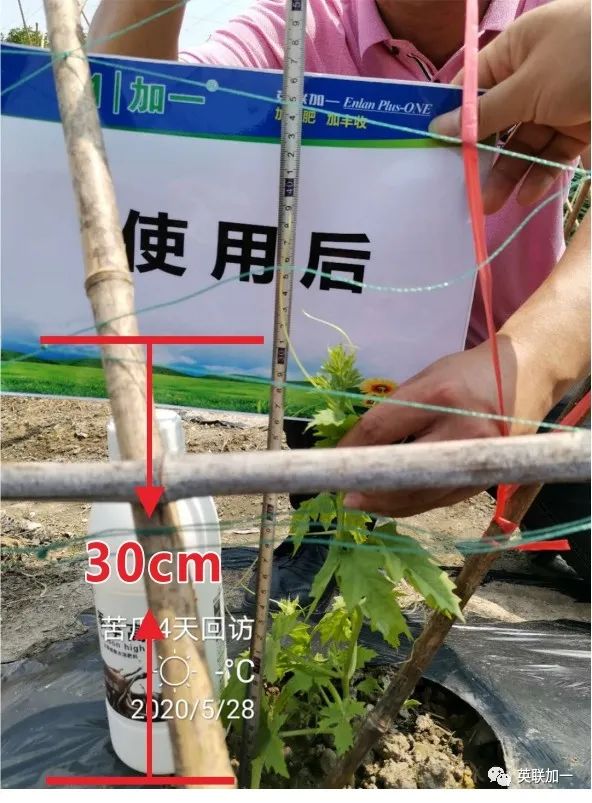 苦瓜苗使用季季高四天后,长高14厘米。苦瓜长势好,根系发达,叶片面积大,植株健壮。