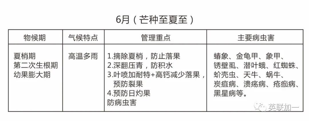 病虫害重点防治:蝽象、金龟甲、象甲、锈壁虱、潜叶蛾、红蜘蛛、蚧壳虫、天牛、蜗牛、炭疽病、溃疡病、疮痂病、黑星病等。