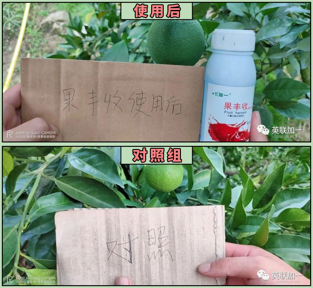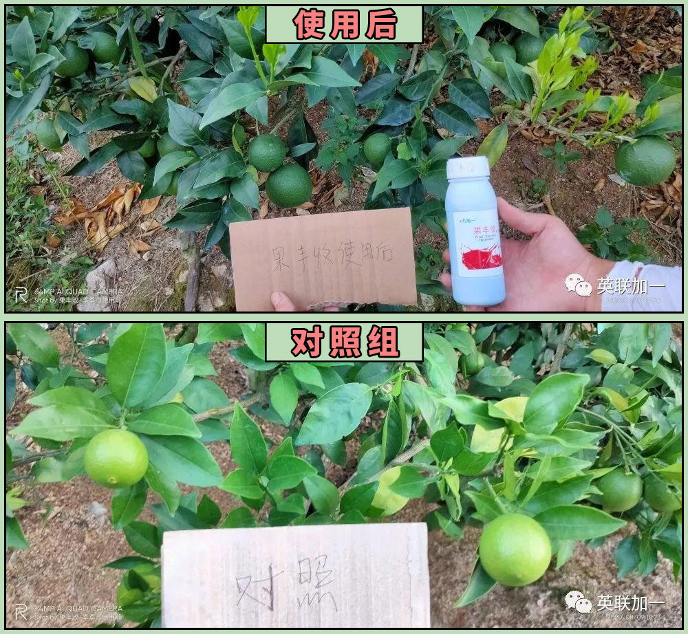 吴大哥是当地的一位老果农,主要种植了大概1000棵的脐橙。7月中旬,加一在当地举办了一场农民会,当时吴大哥听完技术老师的现场讲解后对果丰收着色型非常感兴趣,当即下了订单要购买试试。据吴大哥介绍,他大概在7月18日第一次使用果丰收着色型,效果相当明显。在同一片果地几步之外的距离,有未使用果丰收着色型的果树,对比非常明显。我们一起通过采访视频来看看!