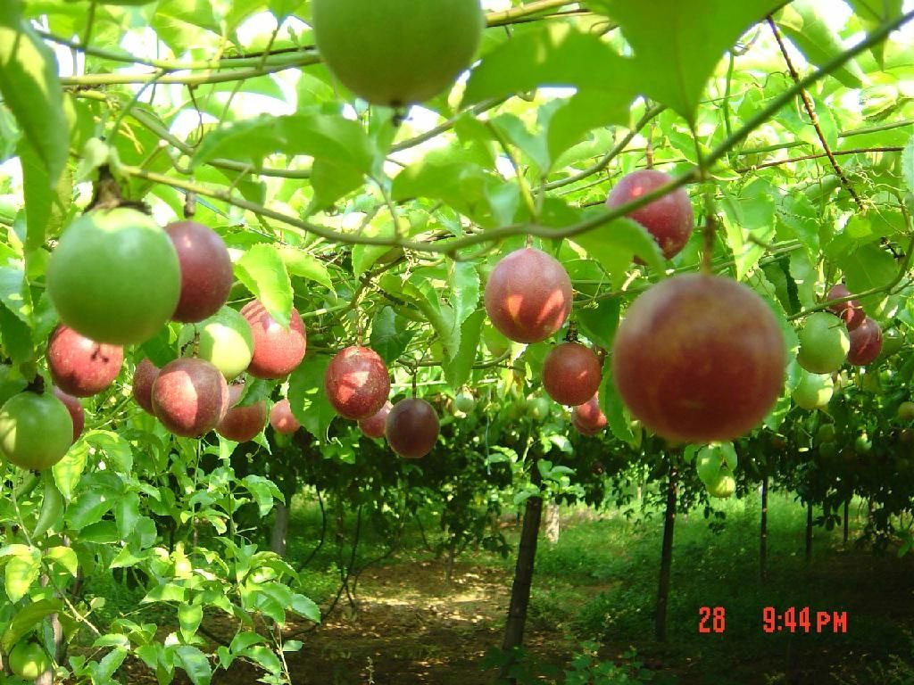 现广泛种植的百香果有紫色百香果、黄色百香果和杂交种等,但自然授粉坐果率约10%~29.6%,需人工授粉。从美国夏威夷引进的紫红色百香果,自然授粉坐果率达60%,含糖量(14.4%~21.9%)和维生素c(49毫克/百克果肉)高、香气浓、产量高。当年种植当年收获,亩产可达2000公斤。
