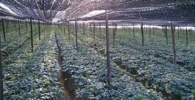 ③每亩硫酸钾10kg拌第一、二或第三种农家肥料1500kg均匀撒施于床面。施肥后,用细竹竿或松树枝将叶面上的泥土全部清除。第二次施肥在7~8月份的现蕾期,追肥的肥料种类和用量同第一次。