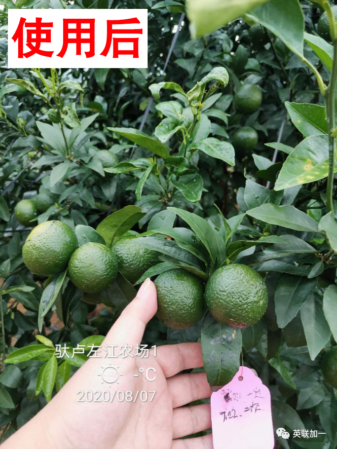 柑橘日灼病:是柑橘果实在快要成熟时的一种病害,主要原因是在夏秋高温季节,果实经受强烈日光暴晒,是果实表面温度达到40度以上而出现的灼烧现象。1、沃柑根系在25℃温度以上生长受到抑制,当温度达到37℃以上根系停止吸水吸肥。3、中微量元素不足,特别是Ca、Si、B,细胞液浓度降低,体内水分运输能力减弱。4、大量使用农药、调节剂,造成角质层、蜡质层变薄,抗晒能力降低。2、A 多肽、氨基酸能够促进叶绿素的合成。(叶绿素主要是脂类和蛋白质分子组成)。B 增加叶子及果实表面的蜡质层,减少水分蒸腾,阻止病原体侵入。3、氨基酸、海藻酸,让柑橘叶子和果面油光发亮,促进蜡质层形成,形成“防晒膜”,树体降温5~10℃。4、钙硼锰锌同补,调节细胞液浓度,提高水分运输能力。用了加耐特的柑橘,果实油绿有光泽,不容易被太阳灼伤。使用了加耐特的柑橘依旧油绿有光泽,未使用加耐特的柑橘已出现明显的日灼现象。 作者:英联加一 来源:创新生物营养科技,成就更好的生活 点击:568次 日期:2023-07-11 |