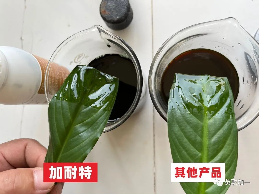 为了消除广大顾客的疑虑,我们进行了加耐特溶液与植物叶片的吸附性和展着力实验,并且与某市场知名品牌同类产品做了对比实验。
