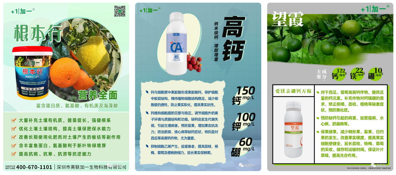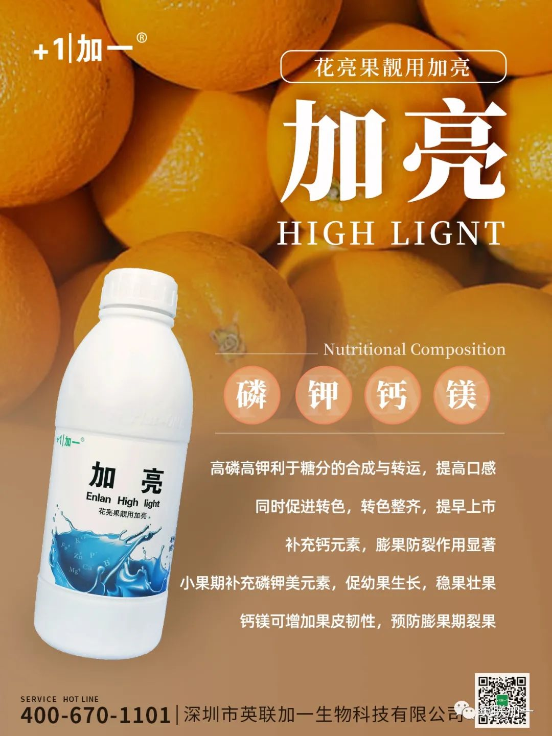 加一推荐产品:加亮 在柑橘保果期使用2-3次,可以让叶片快速的转绿增厚,促进幼果快速转绿,提高坐果率,减少畸形果,为后期膨果积累养分。第一次使用后7-15天使用第二次效果更佳。 2.钙肥的使用能增强幼果细胞壁,使幼果更“强壮”,减少病菌的侵害;