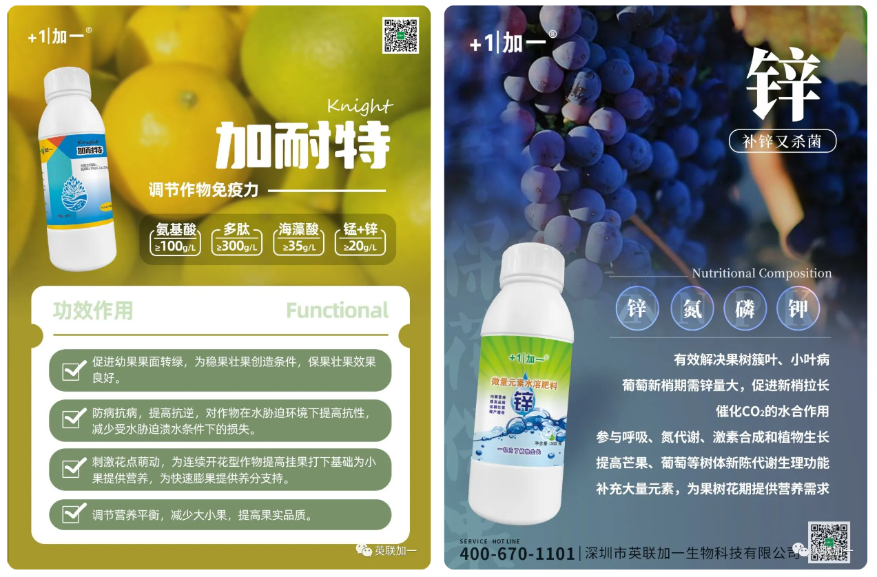加一推荐产品: 根部冲施和叶面喷施同时补充 根本行+高钙/望霞 在柑橘保果期根部冲施根本行、叶面喷施高钙或望霞,可以调节土壤透气性,达到壮梢养根,扩大树冠的目的,从根部补充钙元素,确保幼果生长所需养分,预防柑橘因缺钙而造成的落果,提高坐果率。连续使用2-3次根本行+高钙或望霞套餐效果更佳。 3.硼肥的使用能减少畸形果的发生,减少落果的可能; 在保果期使用英联加一硼肥系列喷施,一是可以为树体补充所需养分、提高坐果率,还可起到增强免疫力,预防叶部病害、花果病害、减少畸形果的作用。连续使用2-3次硼肥系列效果更佳。 4.锌肥的使用能使幼果发育激素的形成和传导,让果实在后期生长得更加均匀。 在保果期使用英联加一的加耐特和锌,可以使叶片快速的转绿增厚,保持叶面油绿有光泽,提高光合作用,提高柑橘整体的免疫力,为后续膨果积累养分。连续使用2-3次加耐特+锌套餐效果更佳。 文中部分内容: 1.百度-贲宠解析科技-“柑橘保果惊醒时,赤霉素使用不当会产生要害,该怎么用?来看下” 2.微信公众号-微补-“柑橘保果方案” 3.部分图片来自网络 |