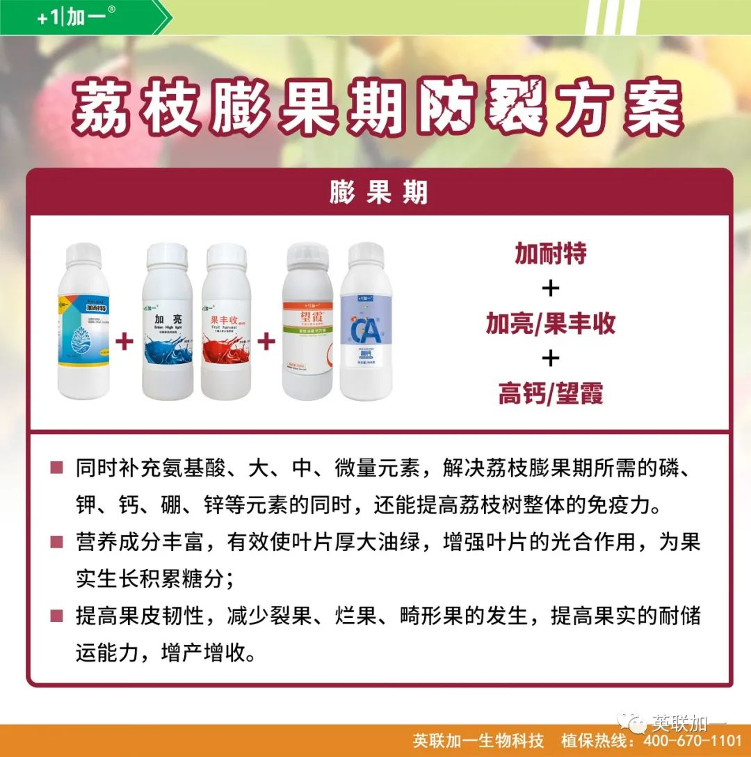 “一骑红尘妃子笑,无人知是荔枝来。” 约莫还有一个多月,把杨贵妃迷得神魂颠倒,果肉鲜甜多汁,风味独特的荔枝就要大量上市了。现在的荔枝正好处于快速膨果期,那我们现在就来聊一聊荔枝膨果的事吧。 在荔枝的膨果期,最容易出现的,就是果实裂果的问题了。 1. 使用过多的氨基酸类、激素类、高氮类叶面肥膨果。营养得到快速补充,果实生长过快,果皮细胞生长慢且较为脆弱而导致裂果; 2. 营养不均衡,偏施氮肥,而钙肥不足,缺少钙元素。果皮细胞与细胞之间的联结能力变差,细胞壁的弹性与强度变低,果肉长得快或者吸水过多,就会加剧果实裂果; 3. 膨果期气候不稳定,水分不平衡,干旱、雨天、高温天气交替出现。当果皮假种皮(果肉)迅速增长时,气候变化,大气气压和空气湿度发生变化,有可能会造成叶片蒸腾能力下降,果肉渗透势降低,最终导致果肉猛长,超过果皮的承受能力就会裂果; 4. 品种间的差异。像糯米糍、桂味等就是容易裂果品种;而黑叶、妃子笑等品种裂果就比较少。 建议补充膨果期需要的的关键营养——磷、钾、钙。 1. 补充关键元素磷,促进细胞分裂,提高荔枝的抗逆性以及对外界环境的适应性,这是膨果的第一步; 2. 补充关键元素钾,促进细胞膨大,促进淀粉和蛋白质的合成,这是果实膨大的必需营养; 3. 补充关键元素钙,增强细胞壁,减少因膨果过快果皮不结实而导致的裂果,这时候补钙还能改善果实的品质。 氨基酸、大、中、微量元素同时补充,解决荔枝膨果期所需的磷、钾、钙、硼、锌等元素的同时,还能提高荔枝树整体的免疫力。营养成分丰富,有效使叶片厚大油绿,增强叶片的光合作用,为果实生长积累糖分;提高果皮韧性,减少裂果、烂果、畸形果的发生,提高果实的耐储运能力,增产增收。