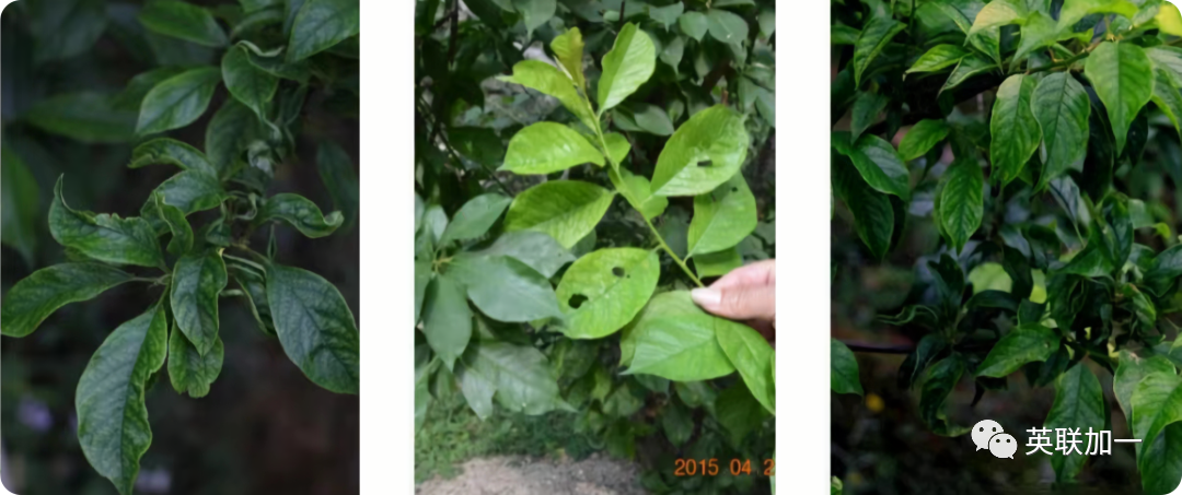 缺铁时,叶片从上到下出现黄白化、黄化到黄绿相间的花纹叶,层次非常清楚。严重时,新梢顶端枯死。