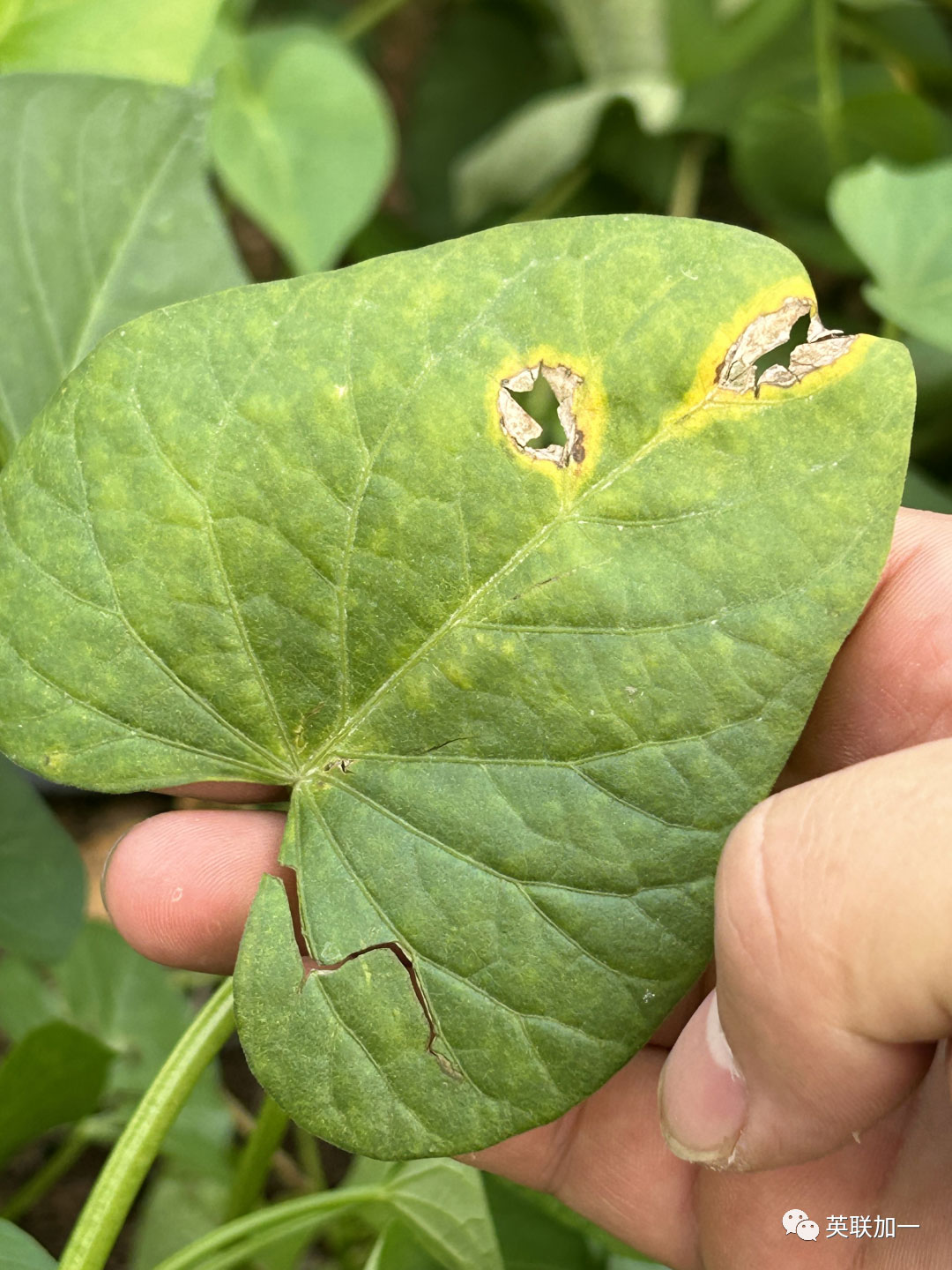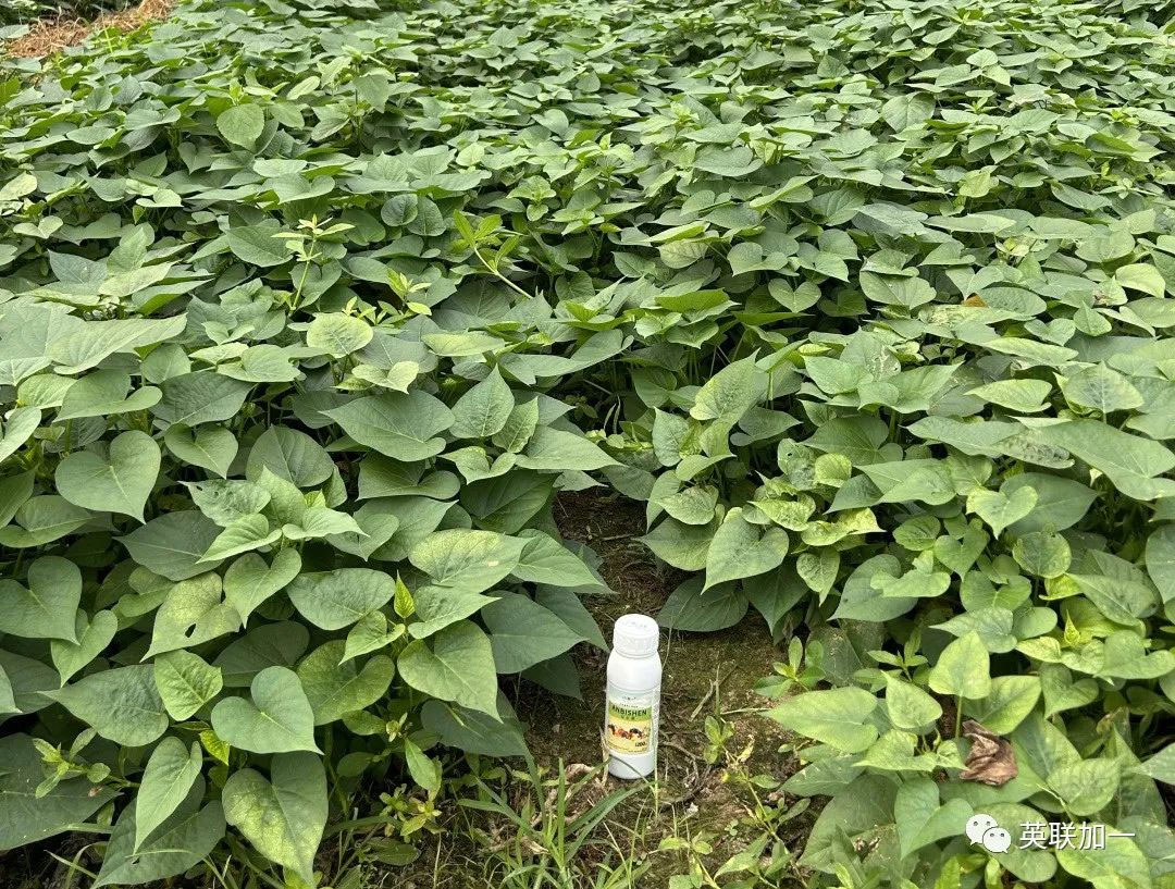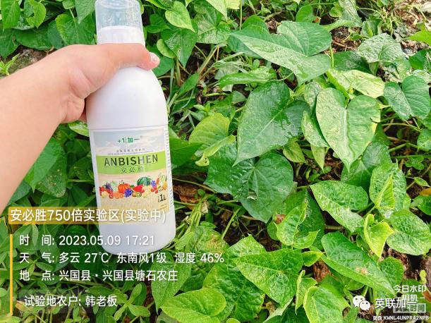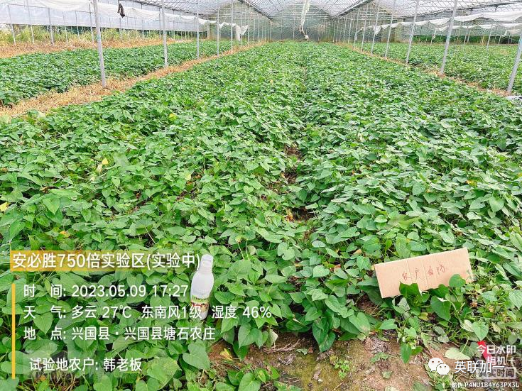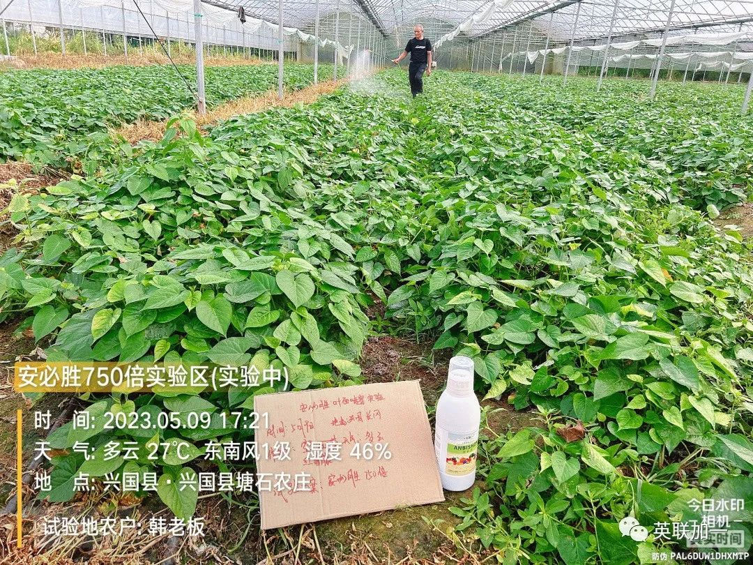试验作物:红薯藤 试验目的:受营养不足影响,叶黄、生长受阻; 使用时间:2023年5月9日 回访时间:2023年5月15日 试验地点:江西省兴国县塘石农庄 使用种植户:韩老板 试验方案:安必胜750倍叶面喷施