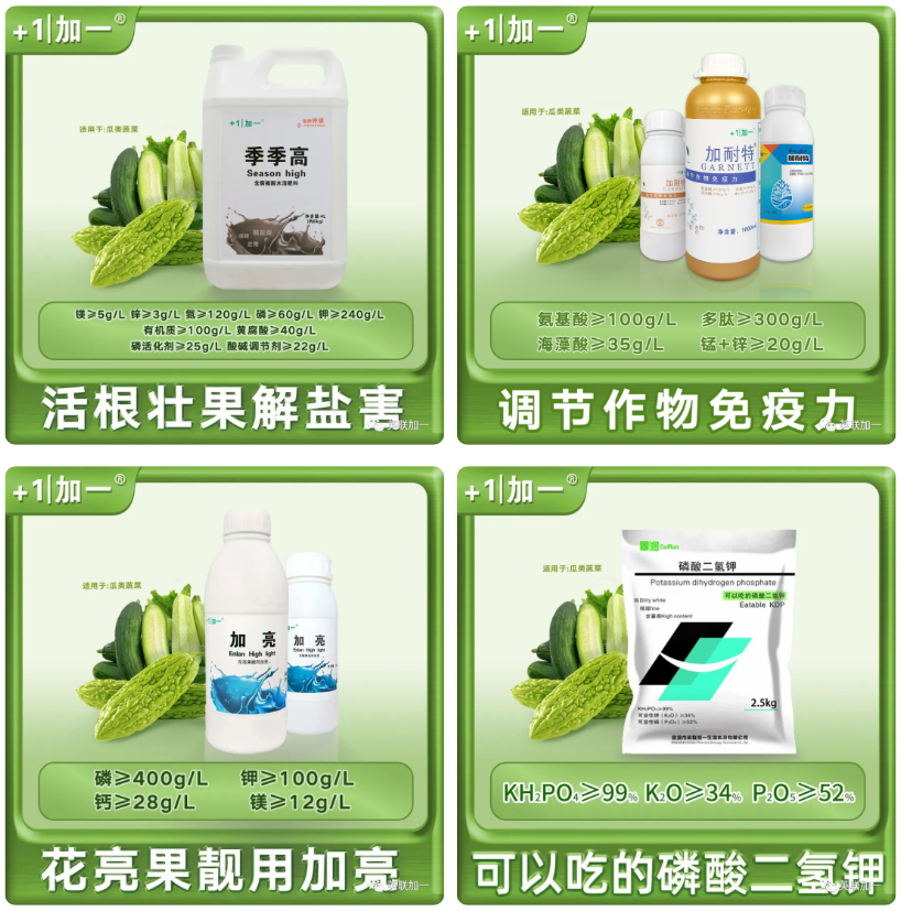 进入了6月,炎热的夏天就来了。闷热的气温,多变的天气,总是会影响人们的食欲。在这个时候,要是能来一碗,微苦但又鲜甜的苦瓜汤,又怎么能不算是开胃呢。 既然讲到了苦瓜,也不能只讲苦瓜的吃法,还要讲苦瓜的种法。那我们今天就来讲讲苦瓜的是怎么种植管理的吧! 种植苦瓜,就要了解苦瓜对土壤和温度的要求。苦瓜原产于印度尼西亚,约在宋朝时传入我国。苦瓜是个耐热不耐寒的作物,苦瓜种子发芽温度需要30℃~35℃,正常生长的温度一般在10℃~35℃,但是生长最适宜的温度是25℃~30℃。 苦瓜的适应性强,对土壤挑剔性小,但土壤越是疏松肥沃、透气性好,产量才能越高,生长的越好。土壤肥力差,苦瓜生长细弱,产量低,质量差。苦瓜生长土壤呈弱酸性,PH值在6-6.7为好。苦瓜属于短日照蔬菜,阳光充足更有利于苦瓜结瓜多;在立秋后,北半球的日照时间变短,夏秋茬种植的苦瓜更有利于苦瓜结瓜。 苦瓜种子的种皮比较厚,所以出苗会比较慢。春夏茬要是直播种植,可以种早一点,在清明前后为宜。播种前可以先用钳子把种子的尖端轻轻地夹破,然后用40°的温水浸泡24小时左右,再进行播种,最后用白膜进行覆盖。条件允许的话,也可以制作一个小拱棚,这样不仅可以增加保温保湿性,还可以帮助苦瓜出苗又快又整齐。 苦瓜根系十分发达,但是根系的可再生能力又十分差的的作物,所以在定植时一定要注意水和温度的管理。苦瓜定植后,要浇足定根水,间干间湿就好。注意刚定植时不要过度施肥,施少量定根肥既可;白天温度最好控制在25℃~28℃之间,夜间温度在13℃~17℃期间为宜。 苦瓜缓苗之后,要适当的蹲苗,然后进行中耕,促进苦瓜根系的发育,为以后多结瓜打基础。苦瓜伸蔓期生长加快,可适当补充氮肥,每亩地3公斤左右尿素,结合叶面肥喷施,0.2%尿素水溶液+芸苔素内酯,促进苦瓜生长更加旺盛,植株更加健壮。 当主蔓长到40cm左右时,要及时搭架。待主蔓全部爬上架后,保留2-3个健壮的侧蔓,与主蔓一起横向绕到架上。等苦瓜苗长到2米左右时,1米以下的侧蔓卷须等要及时去掉,爬上架的侧蔓、无瓜弱枝蔓也要及时去掉,只保留结果蔓,主蔓头部留3-4个侧枝,然后打顶。 当侧蔓长出两朵雌花时,可以进行人工授粉,待两朵雌花长成两个苦瓜时,只保留质量好的苦瓜,另一个疏去。在苦瓜生长中后期的时候要及时植株下部的老黄叶、以及不接果的枝蔓,以增加植株间的通风透气性,防止病虫害的发生。 苦瓜结瓜期需要用的肥水增多,早期一般不追肥,苦瓜盛瓜期需要勤追肥,每7-10天顺水冲施高氮高钾冲施肥,结合叶面肥喷施,0.5%磷酸二氢钾+0.2尿素水溶液+芸苔素内酯,营养补充全面。让苦瓜结的更多。 加一推荐套餐:季季高+加耐特+加亮+翠润