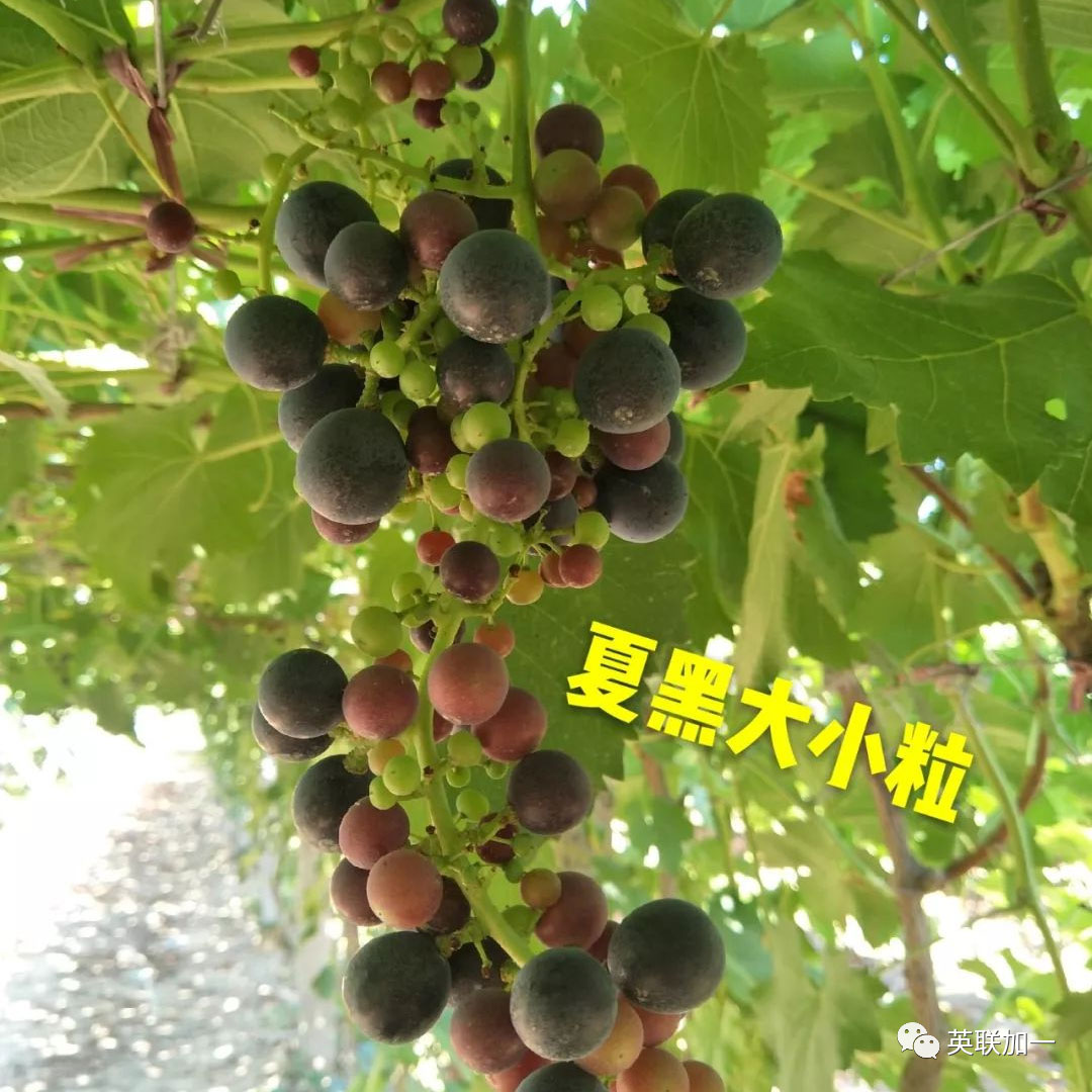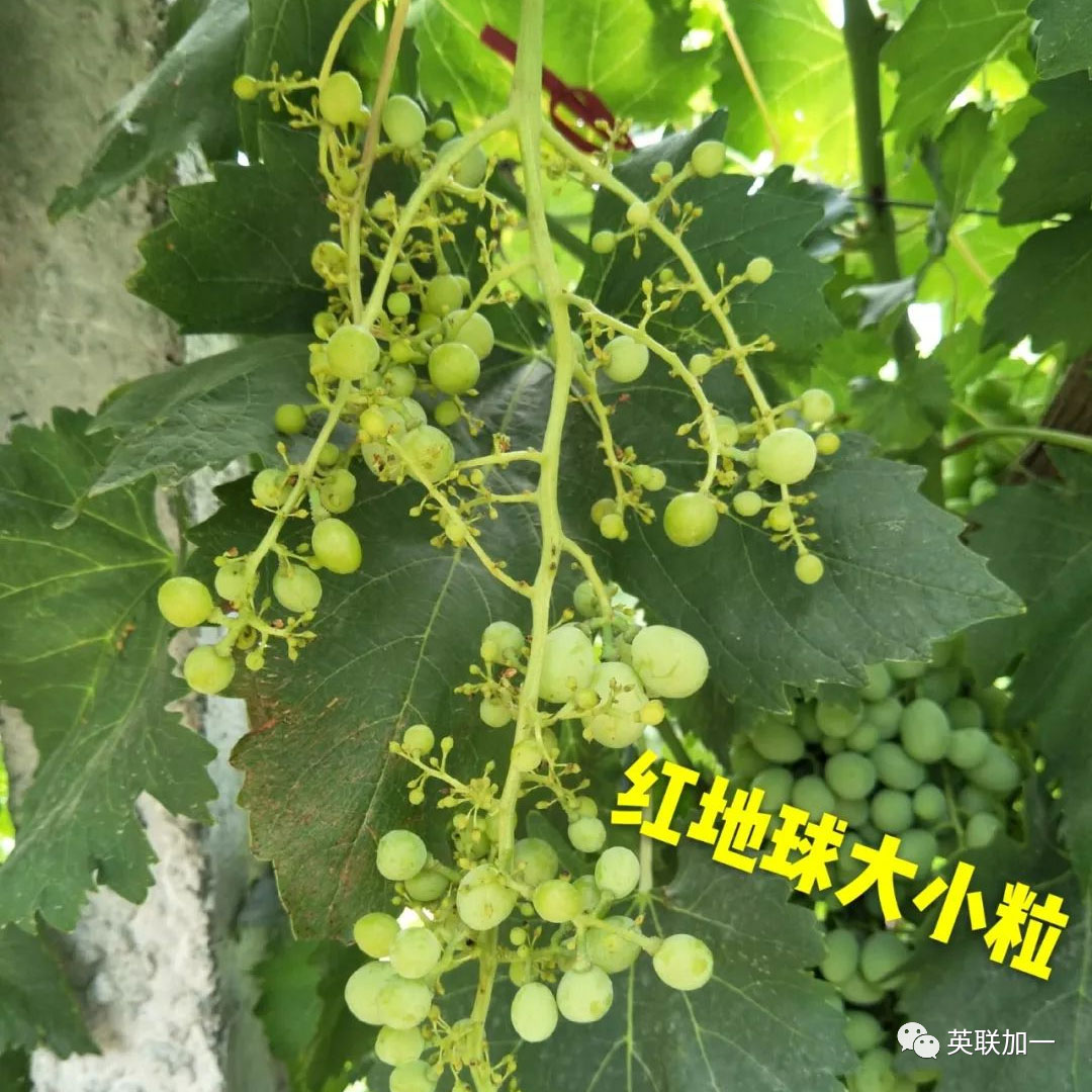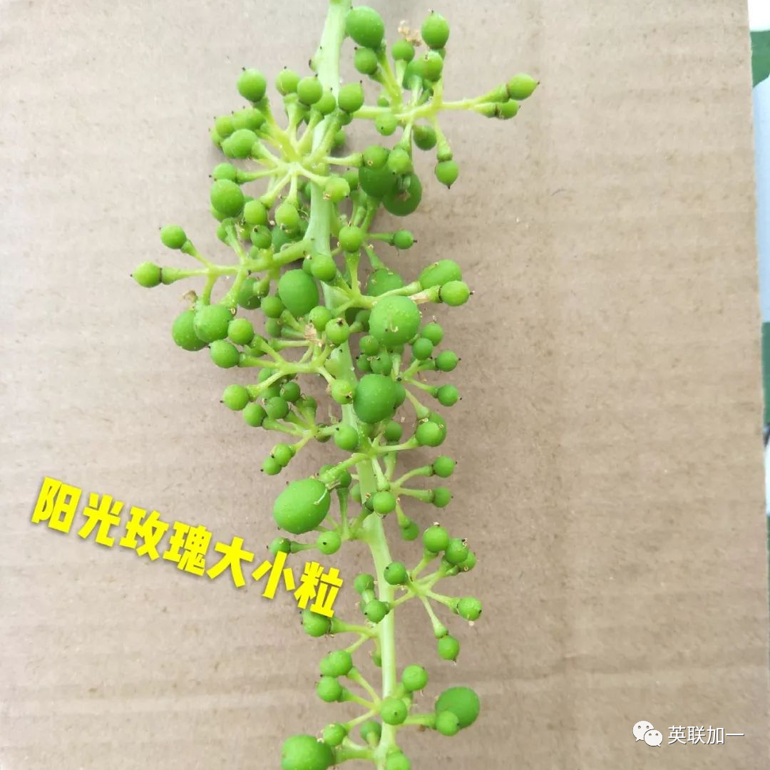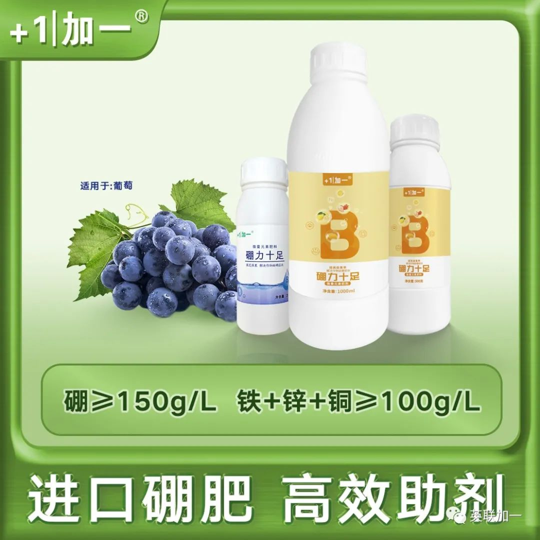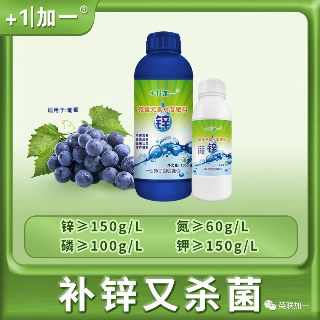 2.缺硼元素 葡萄缺硼也会引起大小粒现象,这是因为葡萄缺硼会导致花粉管的延长受阻,胚珠难以受精,种子不能形成,一般小粒果仅有一粒种子或没有种子,花帽不易掉,坐果也少。严重缺硼的果园,生长迟缓,新梢生长缓慢,叶片会出现西瓜皮样的花叶或对太阳照有花斑。 3.缺锌元素 锌会参与生长素的合成,如果葡萄缺锌生长素的合成会受到影响而不足,生长会变缓,坐果少,花帽会不易掉,容易出现大小粒现象。由于缺锌而引起的大小粒,在成熟时,有些小粒果实内也可能会有种子,而果实的大小粒都可以正常的上色。 4.花期不良气候导致授粉不均 花期的低温阴雨天气或高温干旱天气,都可以致授粉不良,坐果少,大小粒。天气因素形成的大小粒,在田间能看到哑铃型的果穗。低温阴雨在南方地区比较多见;在北方,很多果农担心坐果不好,开花前不敢浇水,一旦遇上高温天气,就会出现大量落果现象。 5.激素使用不当 激素施用不当一般分几个时期,第一个时期是有些品种拉长花序时,施用赤霉酸过晚,影响了授粉,果粒像火柴头那么大,到成熟都不会掉;第二个时期是花期,有不少果园,在花期用控制生长的坐果药,施用不当造成授粉不良,果粒小,串紧,果粒不会正常膨大,有些还表现穗轴加粗等;第三个时期是谢花后,很多果农应用膨大剂类激素过早,造成种子败育,有种皮,黑色的,是空壳,这种果粒明显小于正常果粒。 6.旺长 旺长造成的大小粒表现为枝条粗壮,节较长,有些还表现花序扭曲,花蕾发育不正常等,大粒有种子,特别大,小粒很小,而且坐果少。旺长造成的大小粒,与上年该枝条长势过旺有关,上年旺长,造成花芽分化不良,而当年旺长的枝条,到下年也同样会出现大小粒现象。 7.长势弱 有些果园,发芽后树黄,果穗也是黄的,坐果少,大小粒,有些到下年还是黄的,同样是大小粒。这种果园往往是上年产量过高、受肥害、后期田间积水、冬春季大量伤根、霜霉病致落叶过早等造成。 8.产量过高 产量过高的果园,大小粒表现为成熟期,大粒先上色,先红,小粒是绿色的,花串。这种往往是留果过多,枝条过密,有效叶片不足造成的。 9.病毒病感染或树势退化 对于个别四倍体品种如巨峰等,很容易出现树势退化,或者受病毒病危害的葡萄,树势衰弱,果穗营养不足。这种葡萄,多表现为在只有很少的树这样,田间一两棵树或三五棵树,一样的施肥和浇水,结果少,大小粒,而且是连年这样。 10.修剪不当 葡萄冬季修剪过重,翌年春季新梢生长过旺,导致营养生长和生殖生长不协调,抑制花穗进一步分化。夏季修剪不当也会诱使大小粒发生,当果穗所留叶片不足时,葡萄容易出现树势退化,果穗营养缺乏。 1.合理种植负载。一般果园每亩定产2000kg左右, 最高不超过2500kg。在葡萄花穗延长期(花穗长到5~7 cm)时,开始疏穗,即去掉一个发育不好的花穗;然后修穗,即去掉副穗、肩穗和顶尖,缩短开花期。 (1)增施有机肥, 保持土壤通透性好,根部冲施:英联加一桶肥“根本行”,促进根系发育。氮、磷、钾合理搭配, 适时浇水, 保障开花、坐果和果实生长所需营养。 (2)花前不施氮肥,控制水分,追施硼肥和锌肥,增加授粉成功率。 推荐使用叶片喷施:英联加一叶面肥“硼力十足+锌”