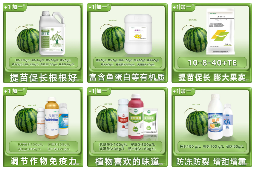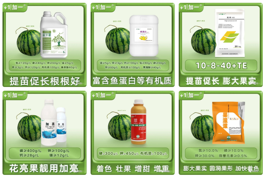 7月盛夏已经来临,又到了广大吃瓜群众大快朵颐分食西瓜的时候,当然这个季节也是瓜农种植西瓜的繁忙季节,特别是很多地区的西瓜正处于膨果关键时期。 那什么是西瓜膨果期,在膨果期怎样做好肥水管理才能种植出又大又甜的西瓜,是瓜农最为关心的问题。加一将为您一一介绍,助力瓜农增产增收。 西瓜果实褪毛到定个为结果中期,也称为膨果期,定个指西瓜果实的体积已基本定型,瓜个已基本发足。 生长特点:西瓜果实生长优势已经形成,营养器官生长基本停滞,植株内的同化物质大量向果实运转,果实成为生长中心,果实体积急剧增长,是形成西瓜产量的关键时期。西瓜膨果期也是西瓜需肥水最多的时期,是肥水管理的关键时期。种植管理上从褪毛开始定期冲施高钾、高钙类膨果肥,还要叶面补充多肽氨基酸类及含中微量元素的叶面肥,防止叶片早衰。 结果中期:施用秋千根或根满壮鱼油型+高钾46,稀释300倍根部冲施。使用加耐特或普拉多米+高钙800倍叶面喷施,间隔5-7天一次。 西瓜果实“定个”到生理成熟为结果后期,也称为变瓤期。此期是决定西瓜品质好坏的关键时期。在种植管理上应减少浇水,保持供水平衡。 结果后期:施用秋千根或根满壮鱼油型+高钾46,稀释500倍根部冲施。使用加亮或翠美+果滋滋800倍叶面喷施,间隔5-7天一次。