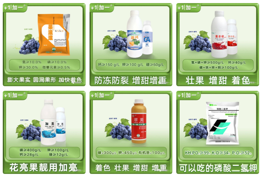 1. 肥水管理: 转色期间少施或不施氮肥,以钾肥为主,辅以磷、钙、镁等元素,除根部追肥外,还应叶面补充叶面肥以提高葡萄品质。英联加一推荐转色期营养方案: