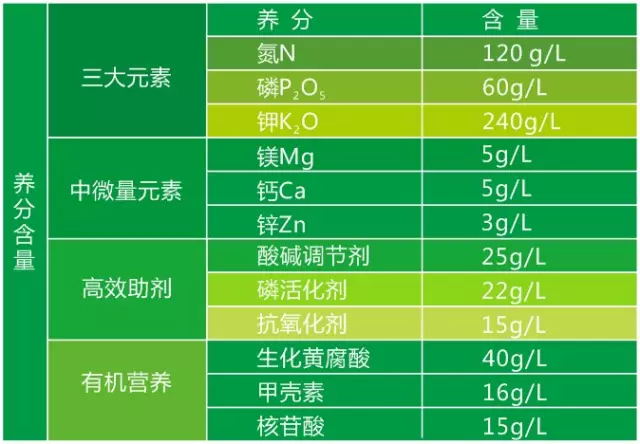 3、氮磷钾元素含量达420g/L,螯合中微量元素营养全面。