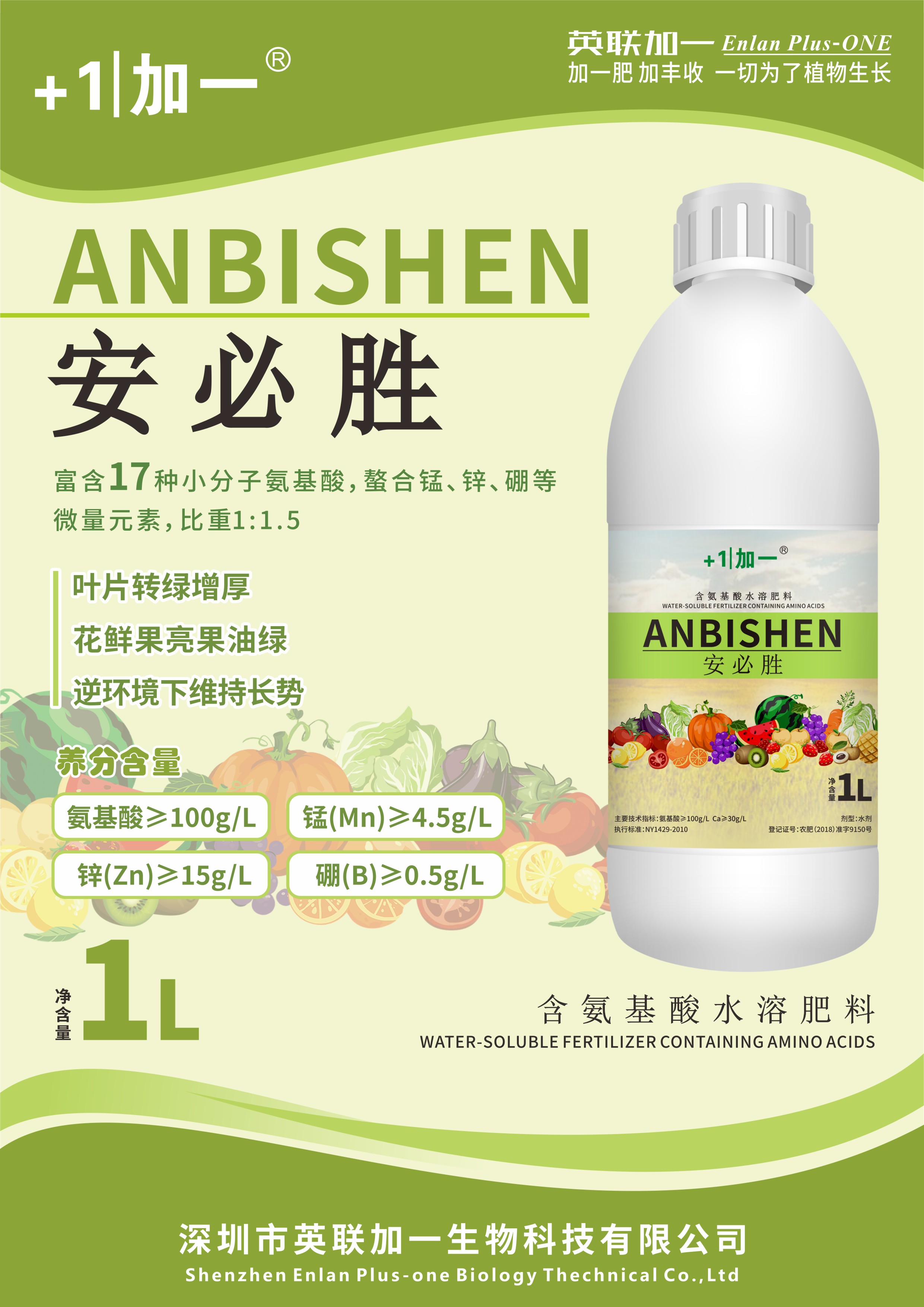 氨基酸>100g/L 猛(Mn)>4.5g/L 锌(Zn)>15g/L 硼(B)>0.5g/L 1.增加叶绿素、叶片转绿增厚,增强树势,减少病虫害。 2.促进生长,出梢和展叶效果好,提高叶片的韧性。 3.防止裂果、延长作物采摘期,增产增收。 4.作为营养输送的载体,提高作物免疫力,防止早衰,提高果实耐储藏能力。 5.有效的促进根部发育及活化土壤,改善土壤环境。