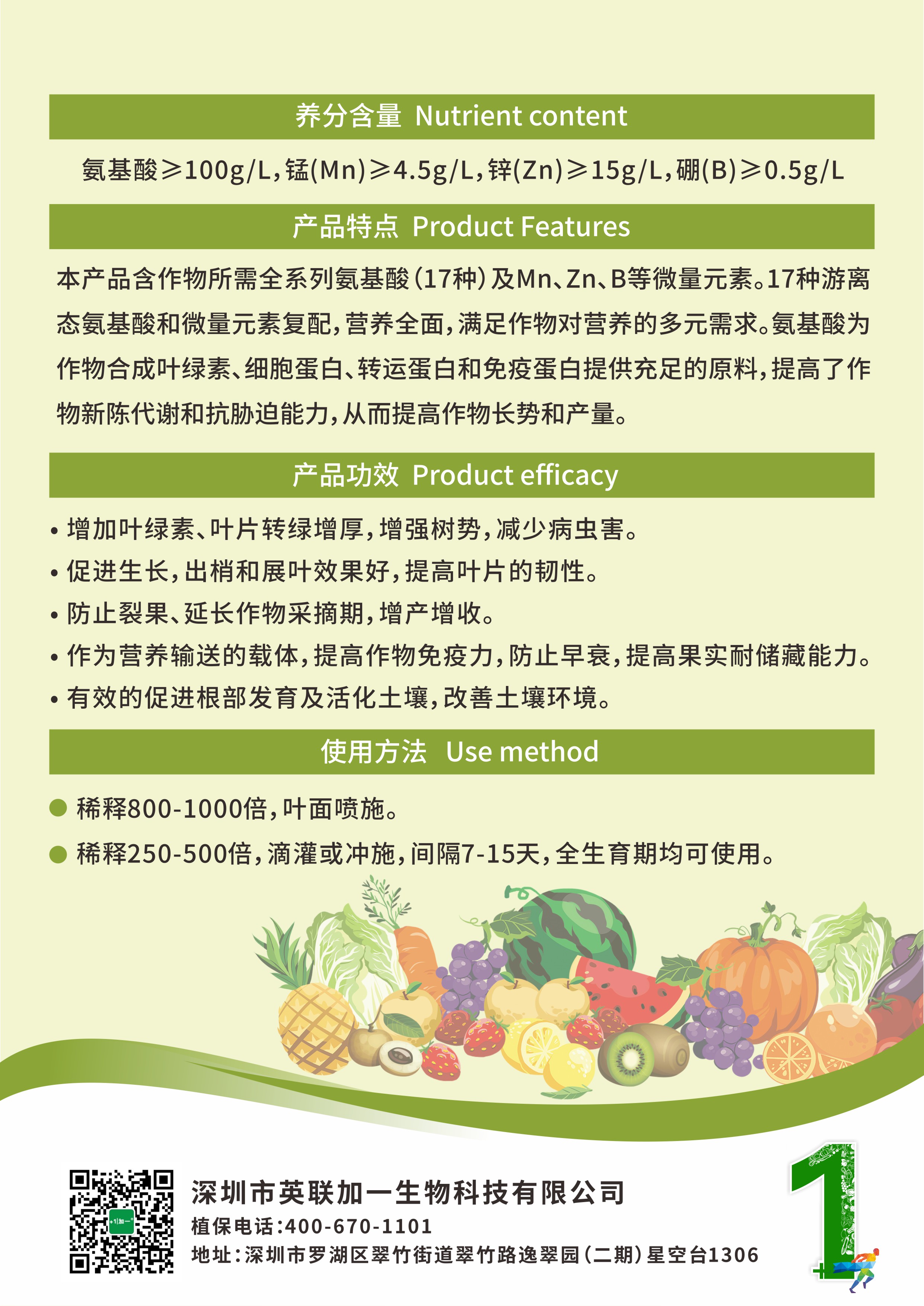 本产品含作物所需全系列氨基酸(17种)及Mn、Zn、B等微量元素。17种游离态氨基酸和微量元素复配,营养全面,满足作物对营养的多元需求。氨基酸为作物合成叶绿素、细胞蛋白、转运蛋白和免疫蛋白提供充足的原料,提高了作物新陈代谢和抗胁迫能力,从而提高作物长势和产量。
